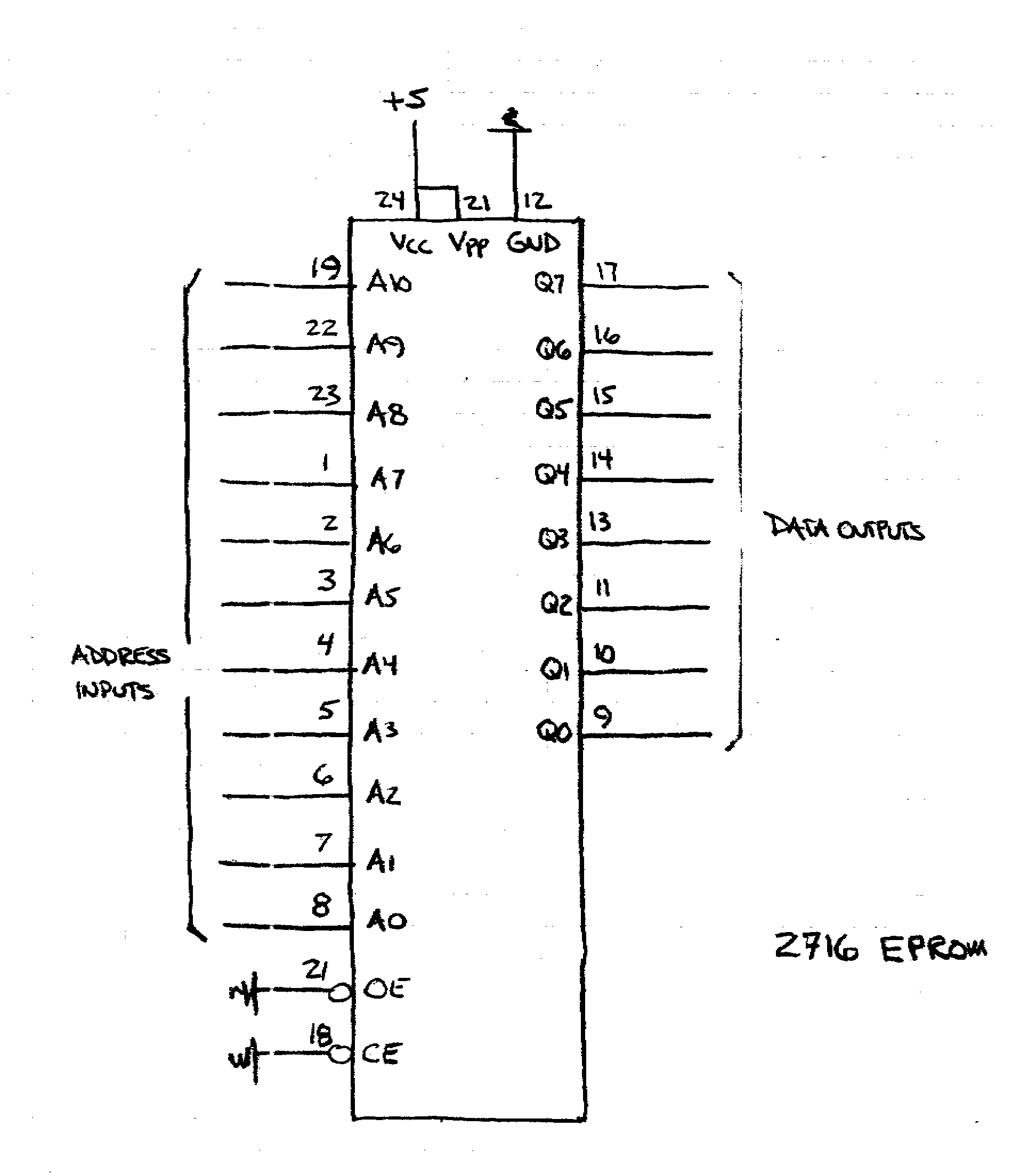 Note that input /OE (output enable) causes outputs to be at high Z when at logic 1. When at logic 0, data at address determined aby A_10 - A_0 appears on output.
